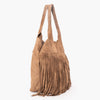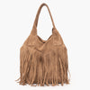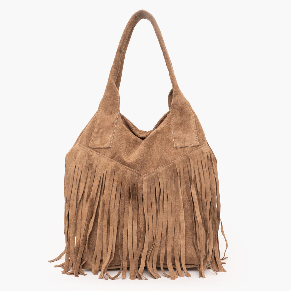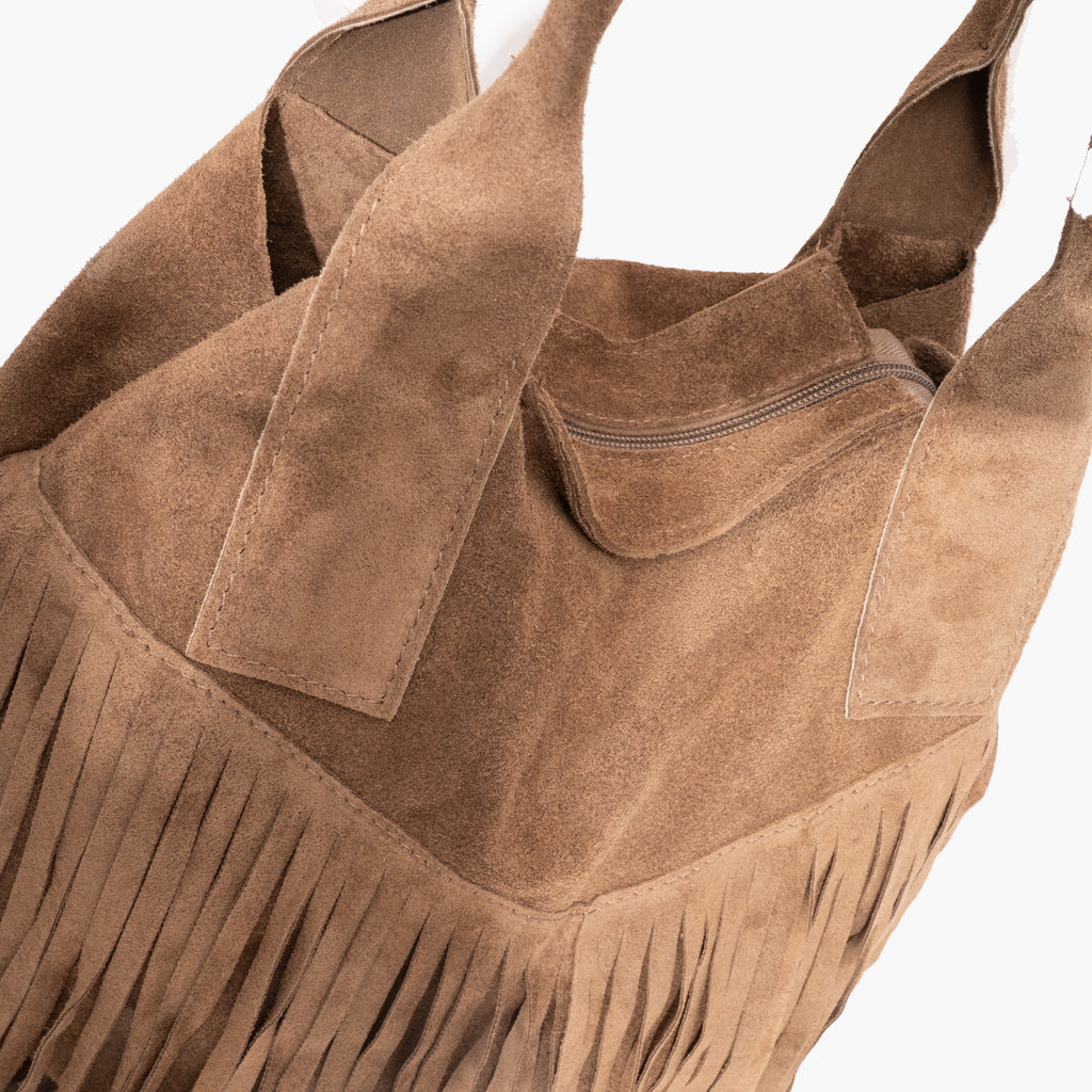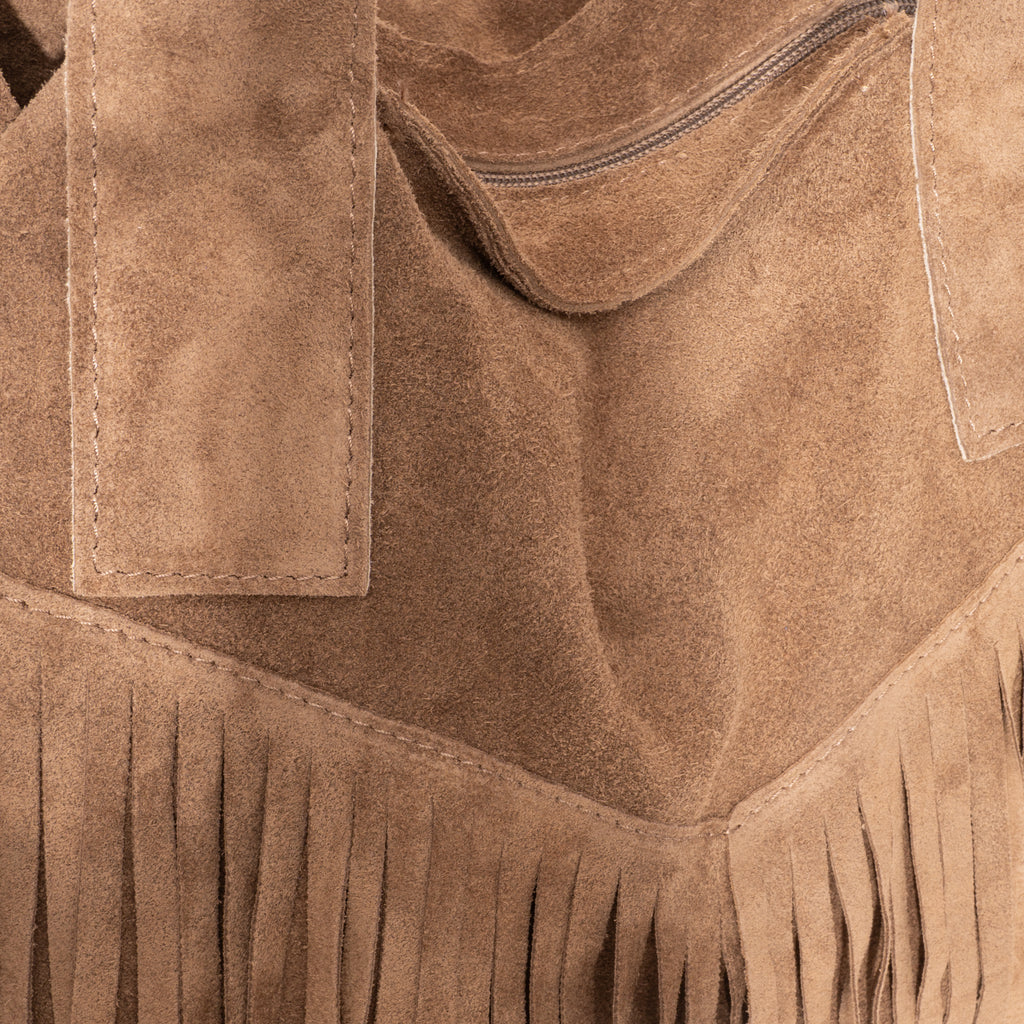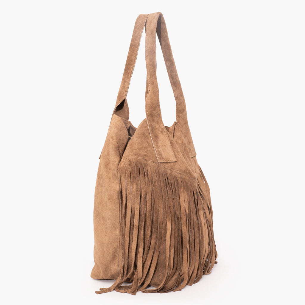 Bolso de piel de serraje en color topo con detalle de flecos.