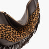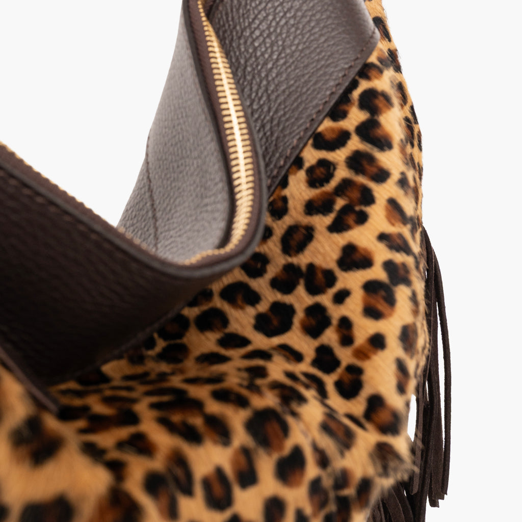 Bolso hobo que combina piel graneada marrón con pelo natural con print de leopardo.