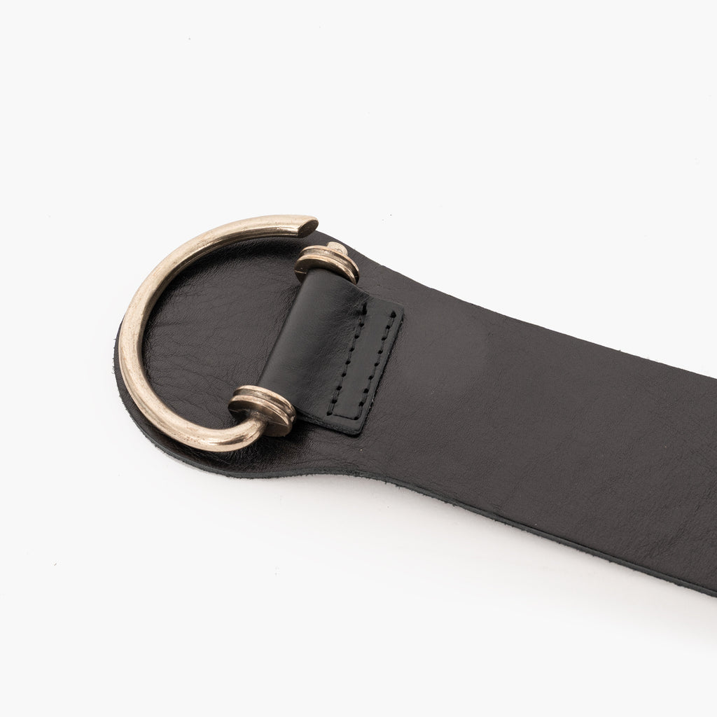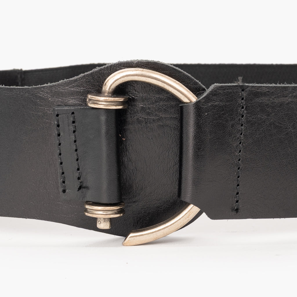 Cinturón de piel lisa negra con elástico en la parte trasera.