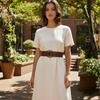 Cinturón de piel lisa marrón con elástico en la parte trasera.