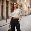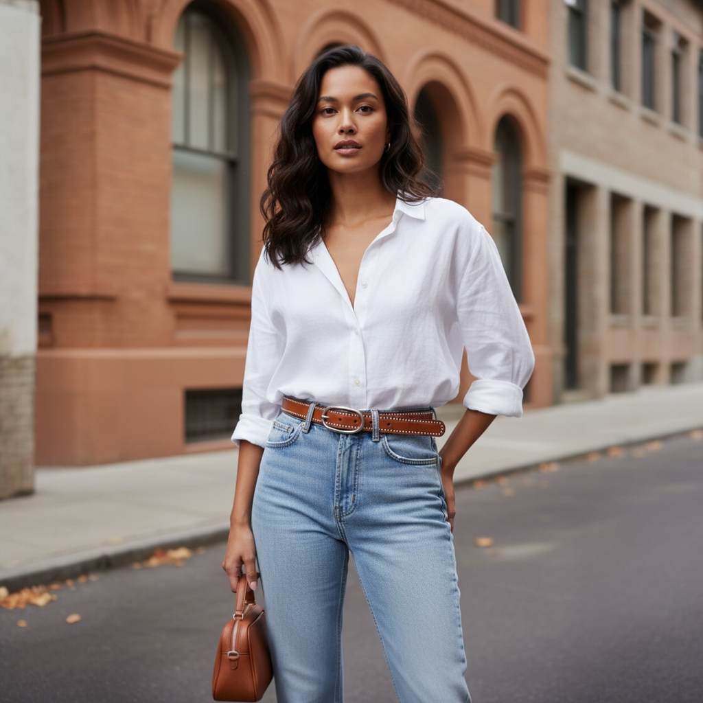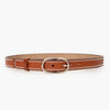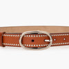 Cinturón de piel color cuero con tachitas y hebilla plateadas.