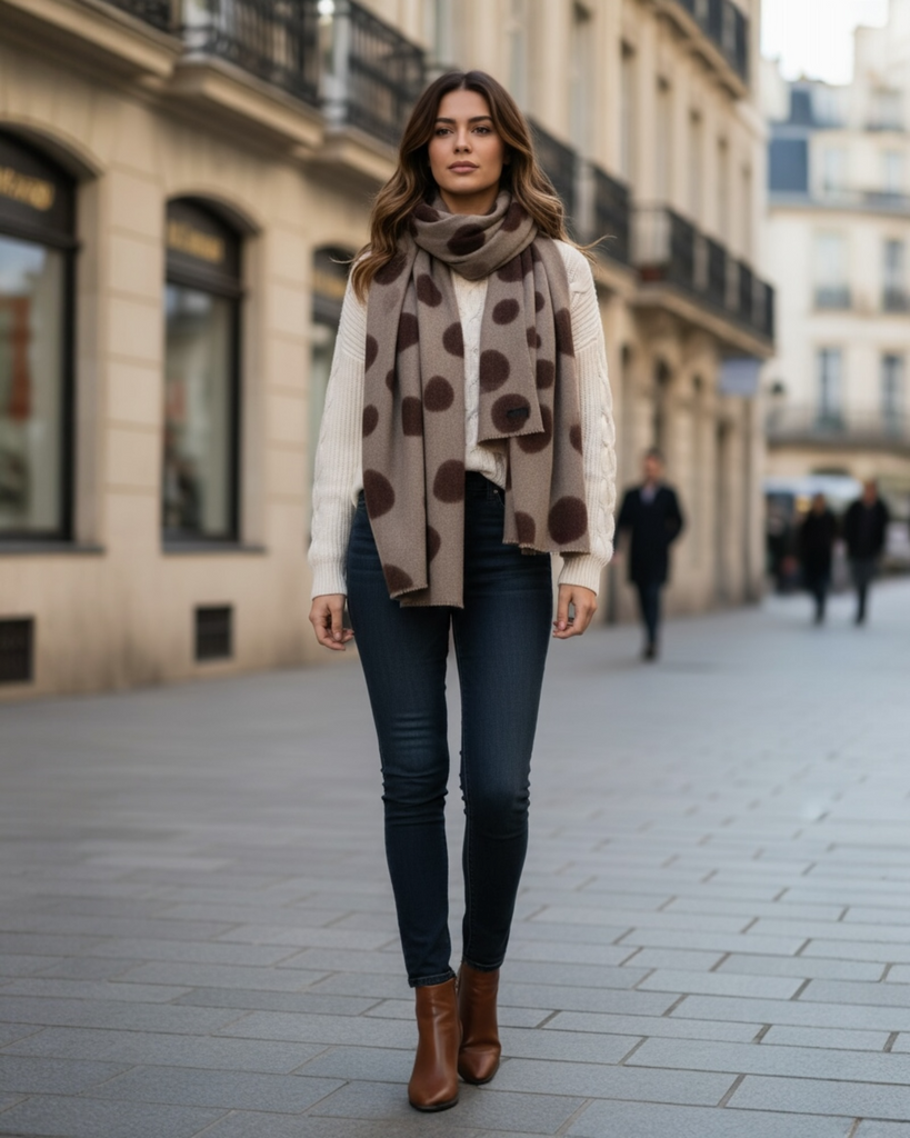 Fular con estampado de lunares marrones sobre fondo verde kaki.