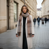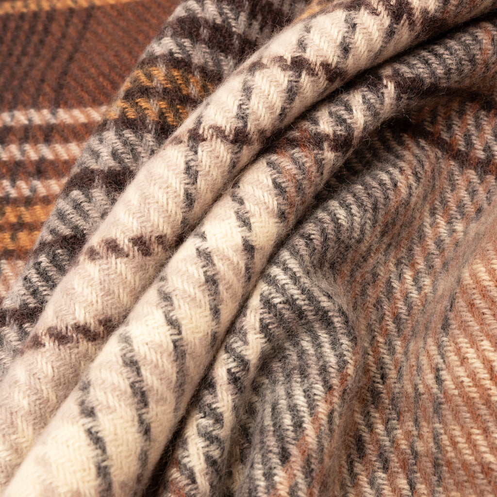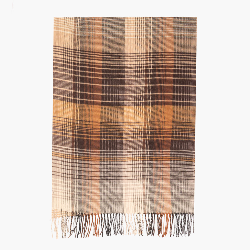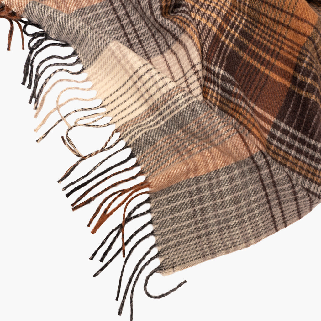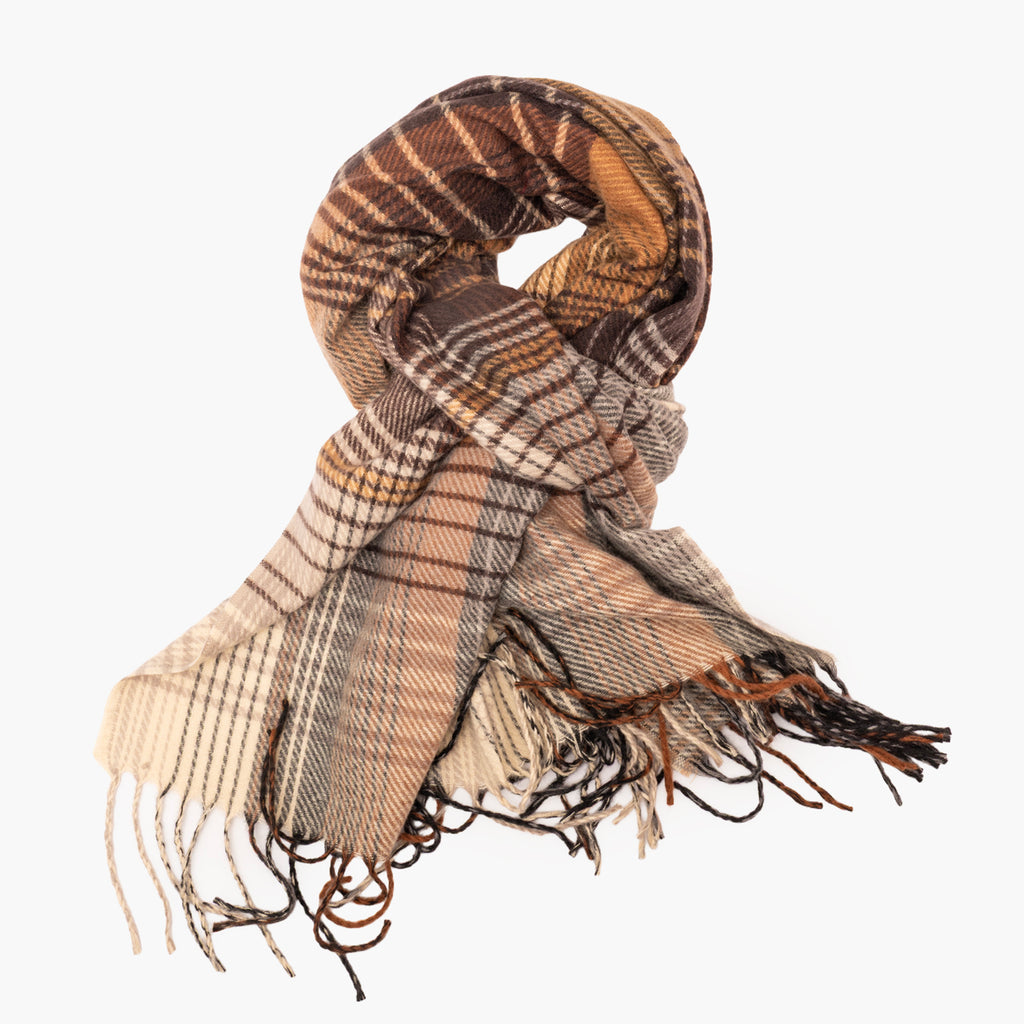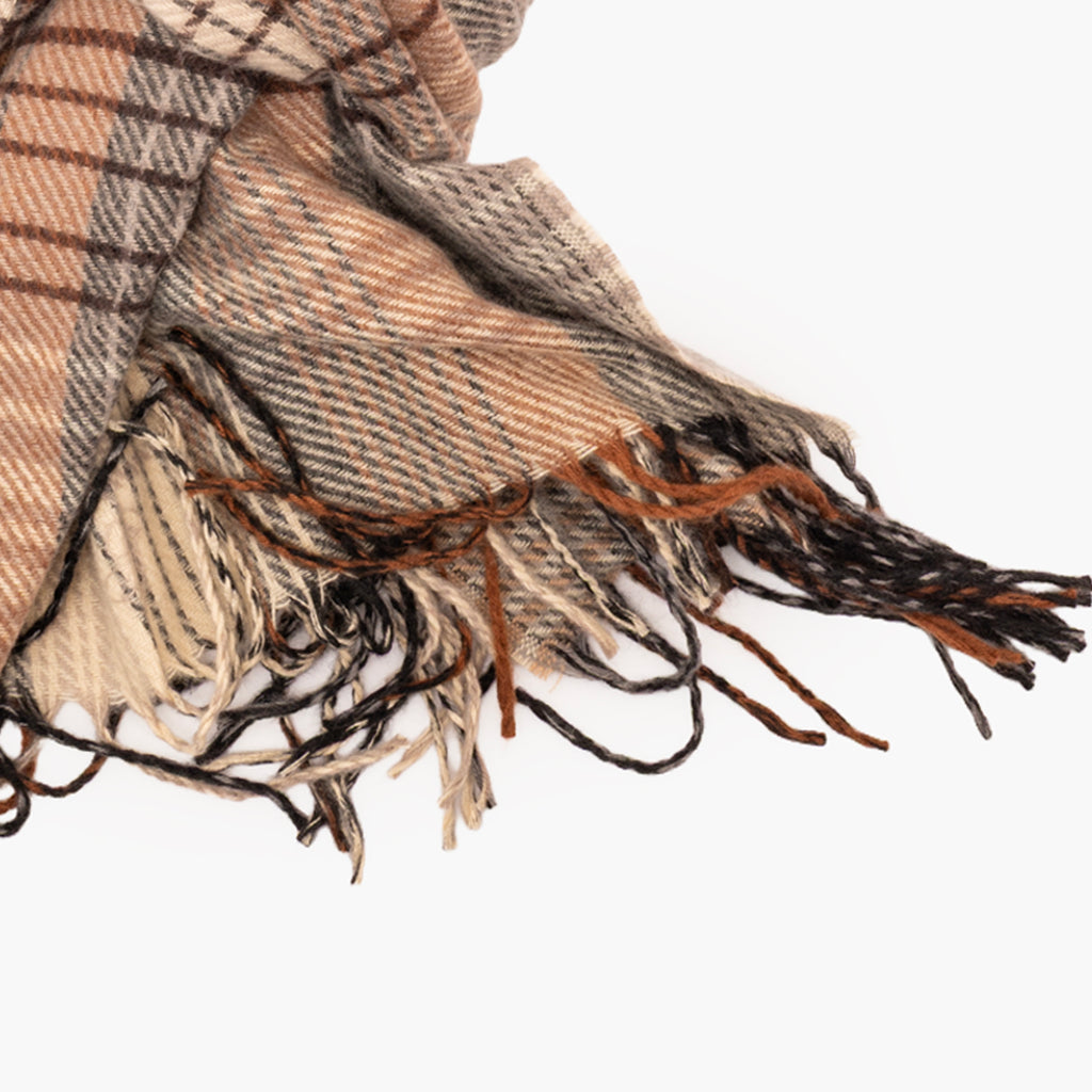 Bufanda con tejido de cuadros en gama de marrones y grises.