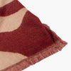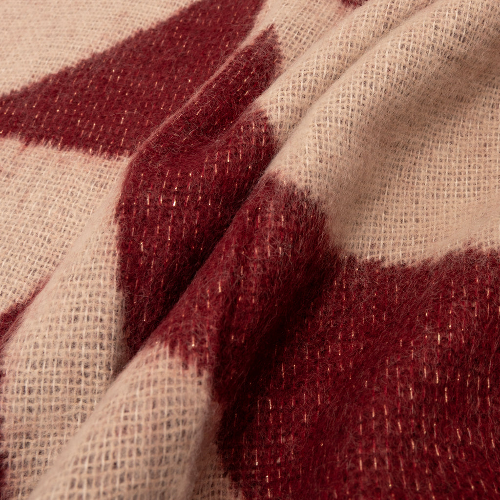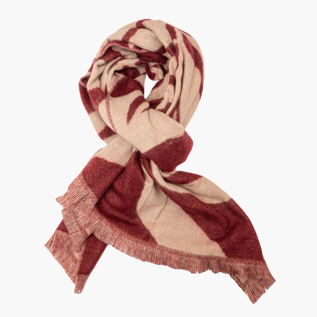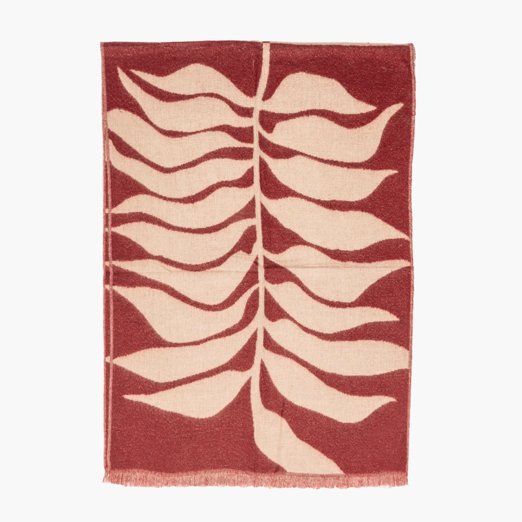 Fular con dibujo de hojas en color burdeos y maquillaje.