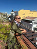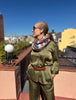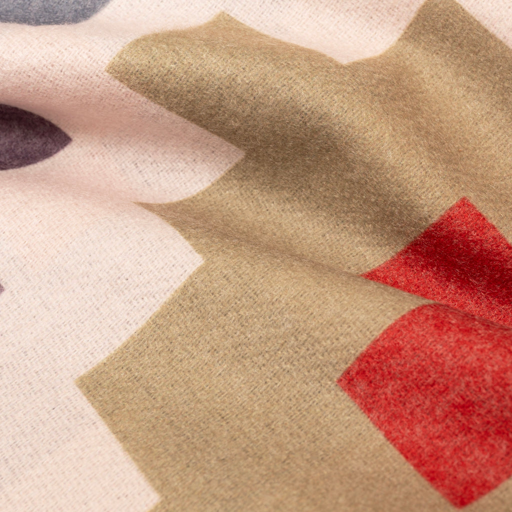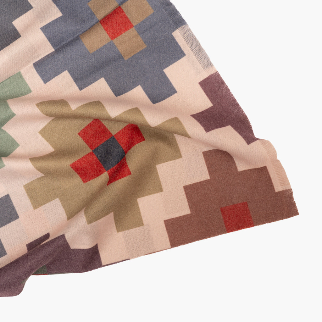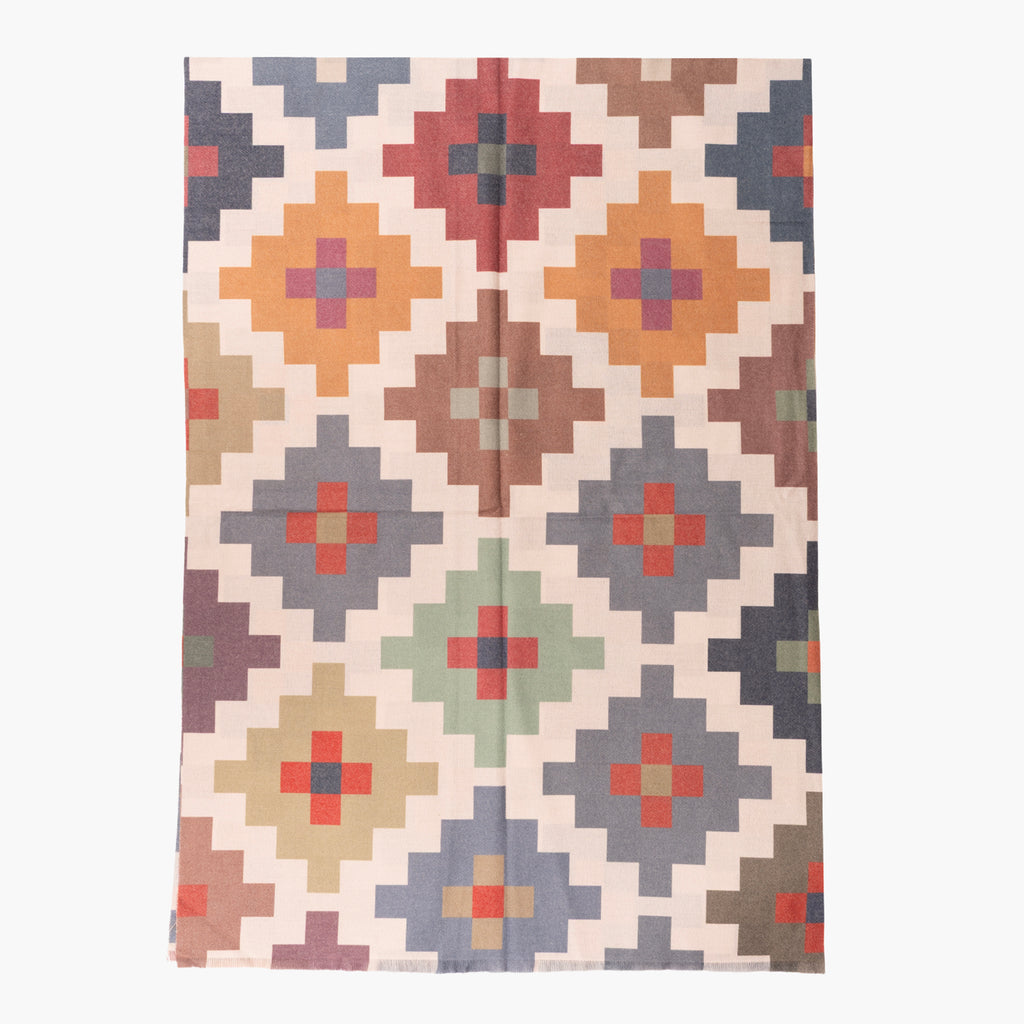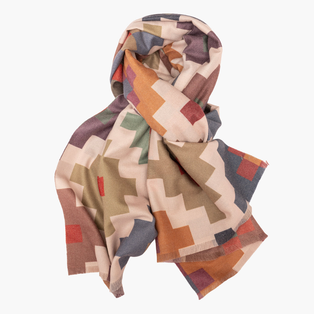 Fular con dibujos geométricos multicolores sobre fondo beige.