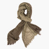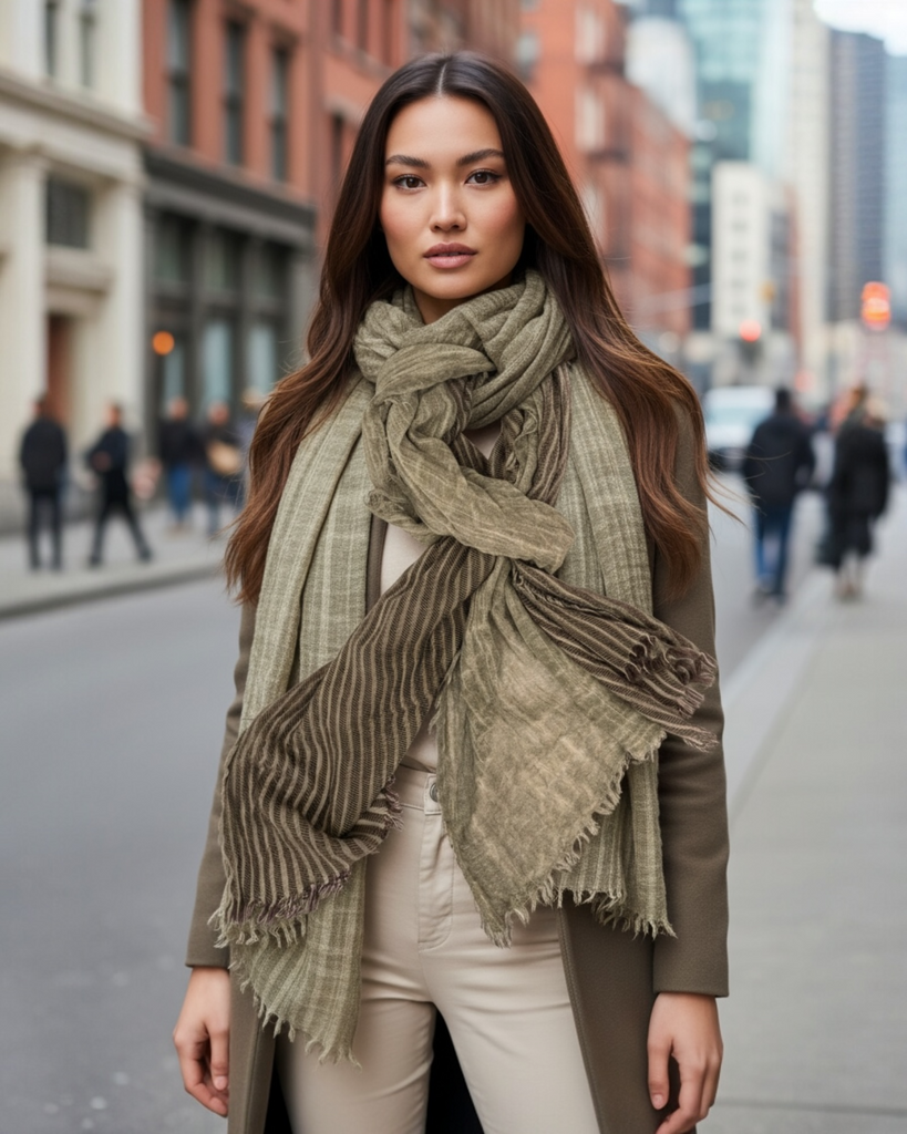Fular que combina una parte de rayas verde kaki y negras, con otra parte lisa de color verde.