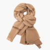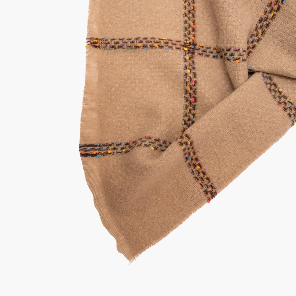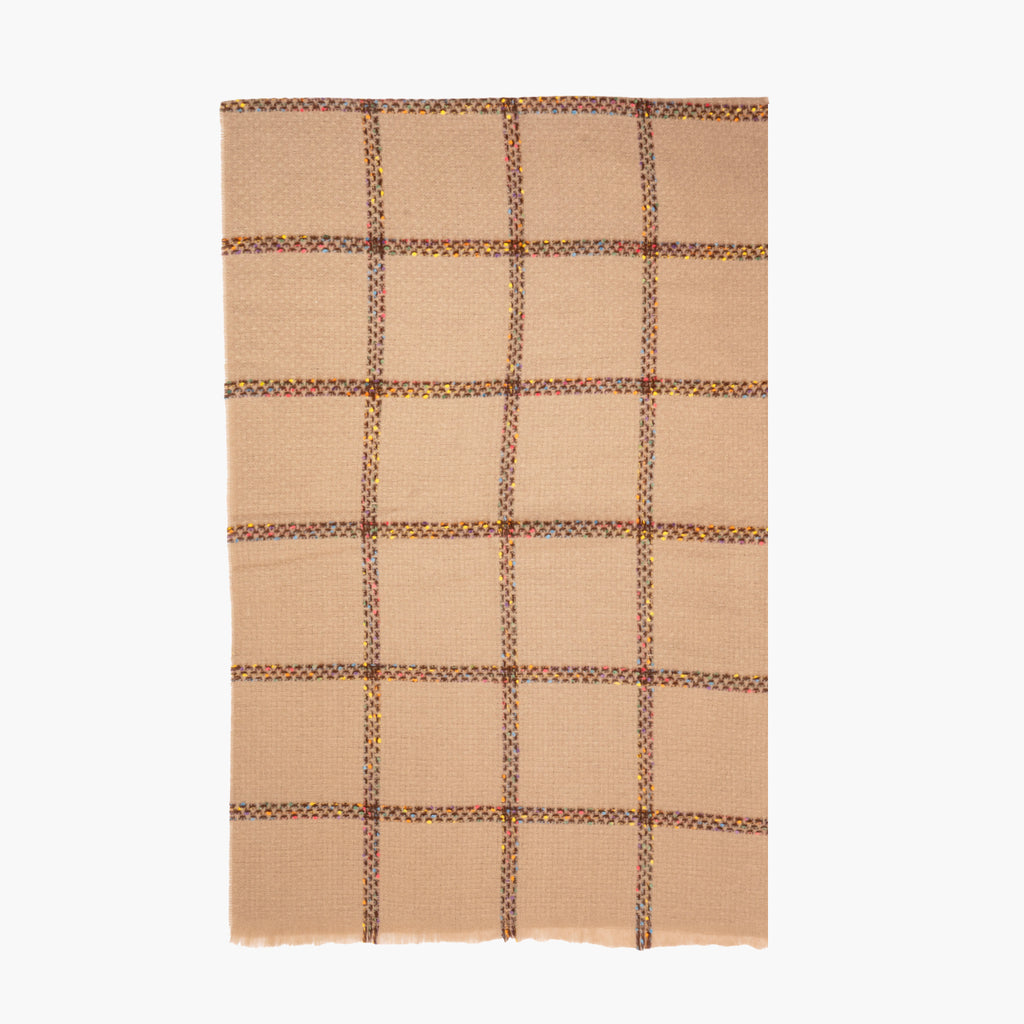 Bufanda color topo con cuadros multicolores.
