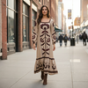 Vestido largo beige con dibujo de flores y ramas en color marrón y burdeos.