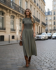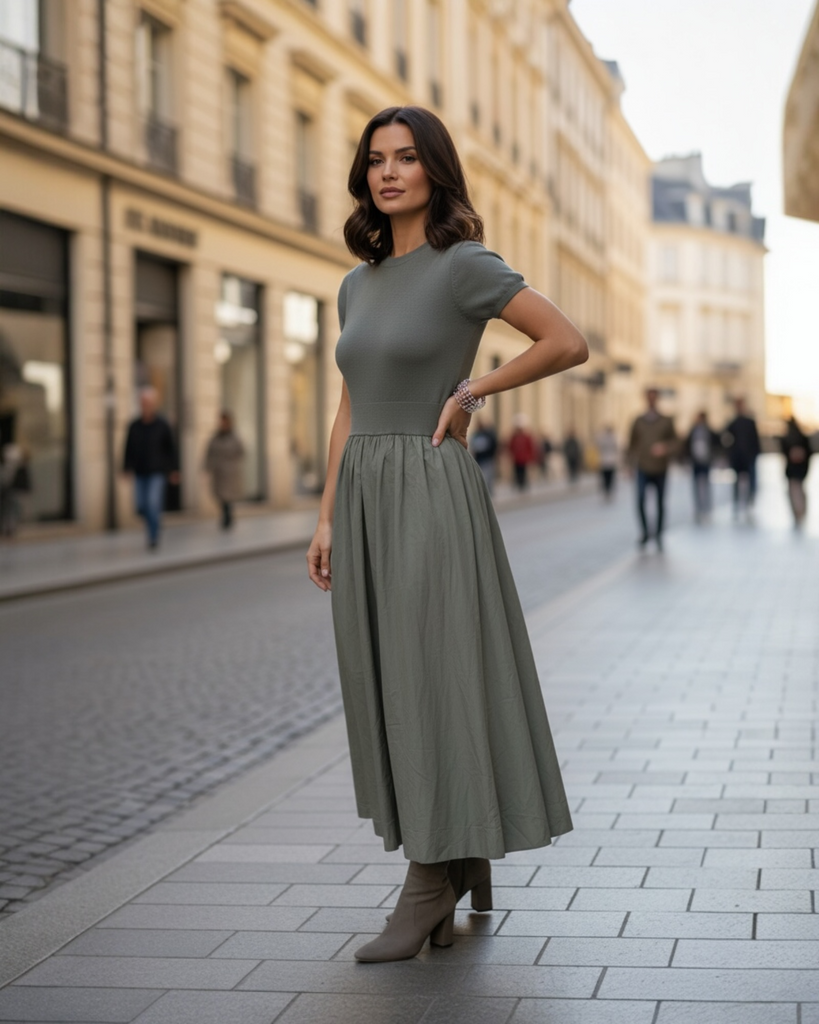 Vestido largo de manga corta con top de punto en color verde kaki.