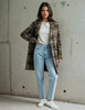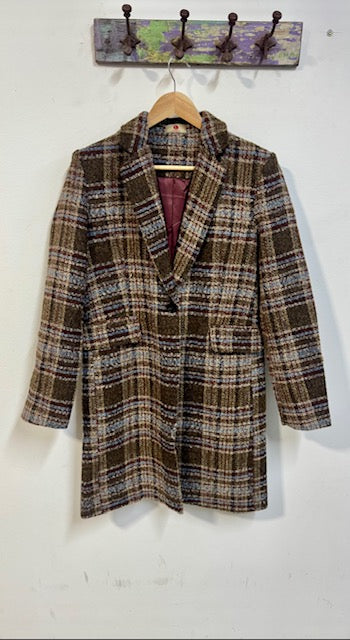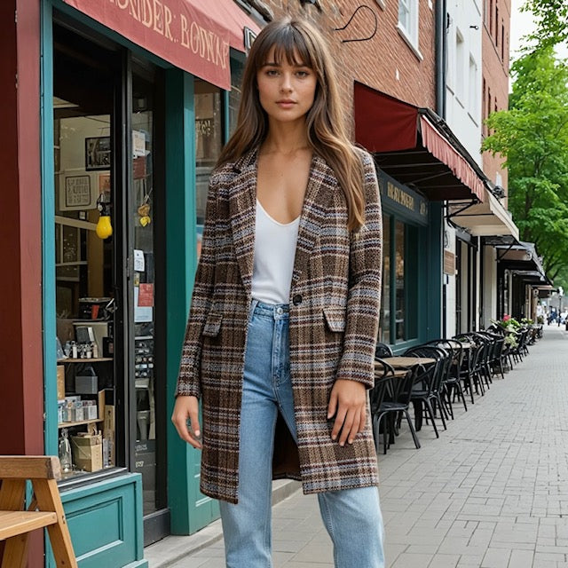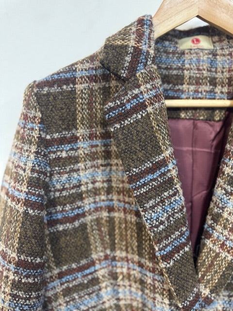 Abrigo con tejido de cuadros en color marrón, azul y granate.