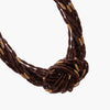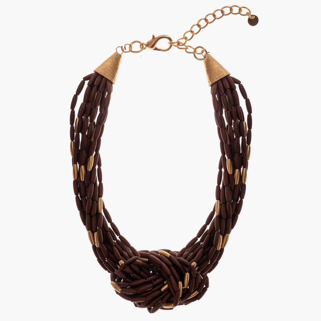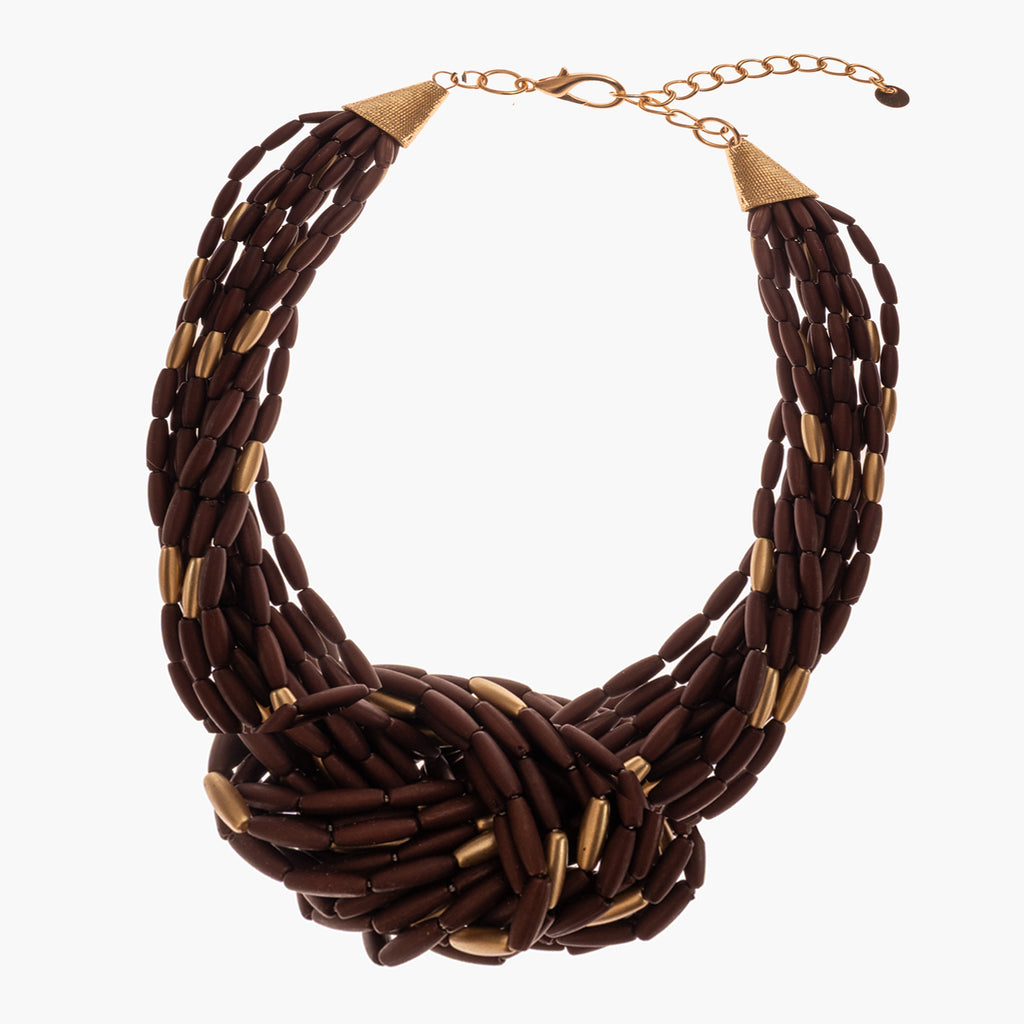 Collar multi-vueltas con nudo central. Formado por tubitos marrones y dorados.