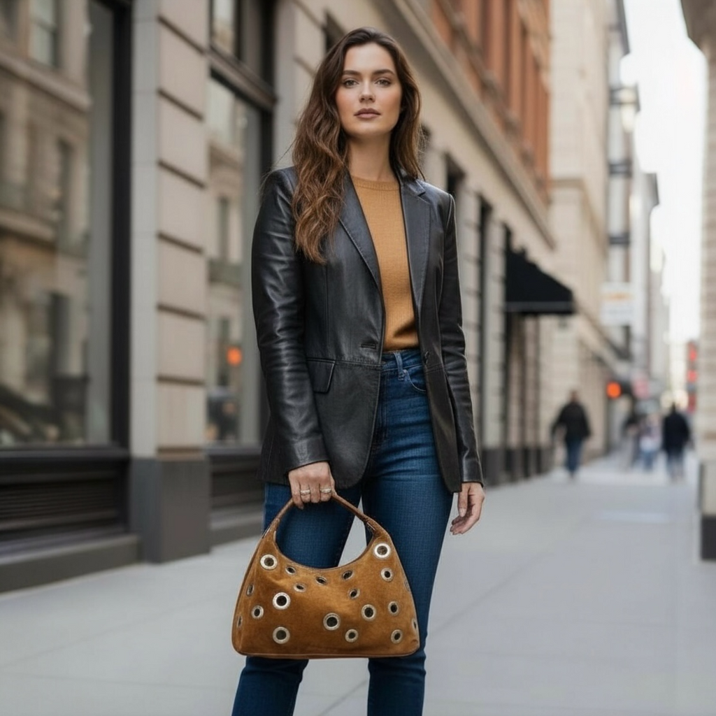 Bolso de piel de serraje color cuero con detalle de hollados dorados.