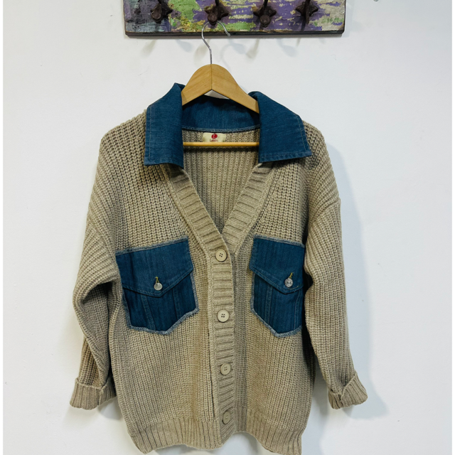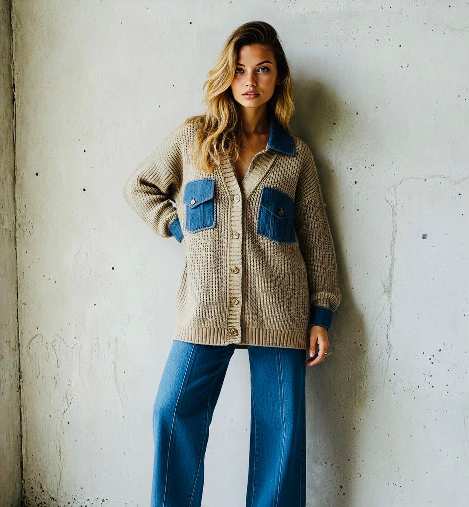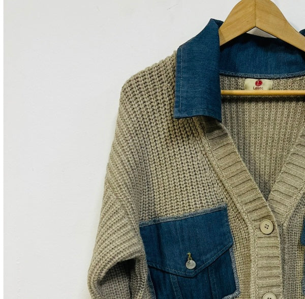 Chaqueta de punto en color topo con bolsillos y cuello de tela vaquera.