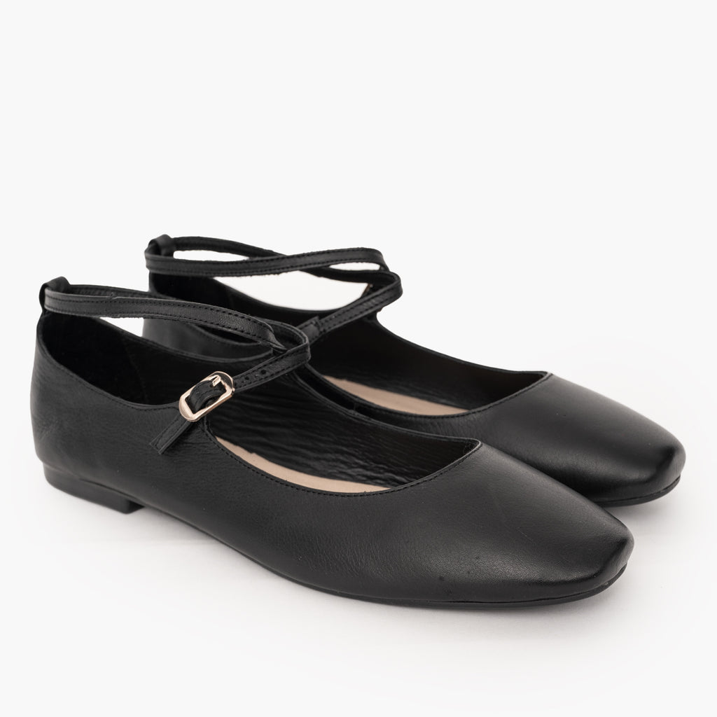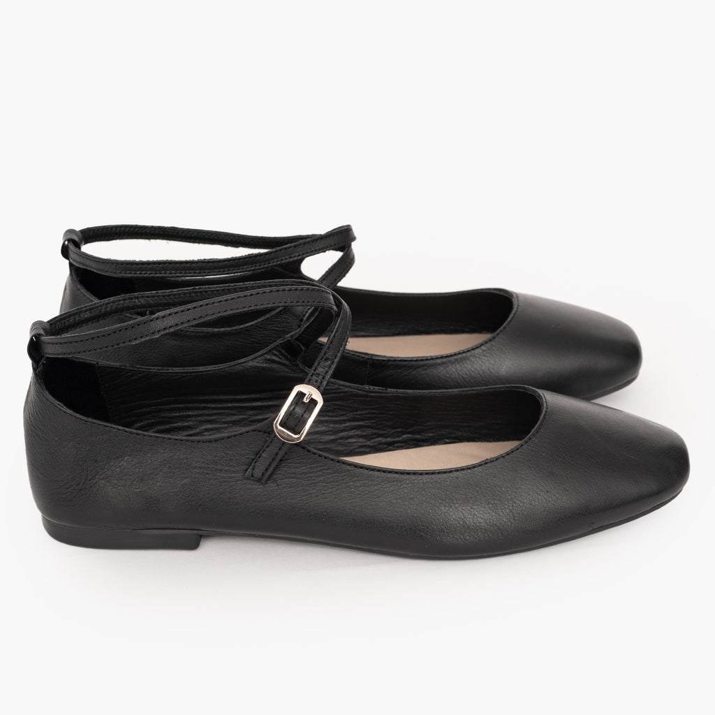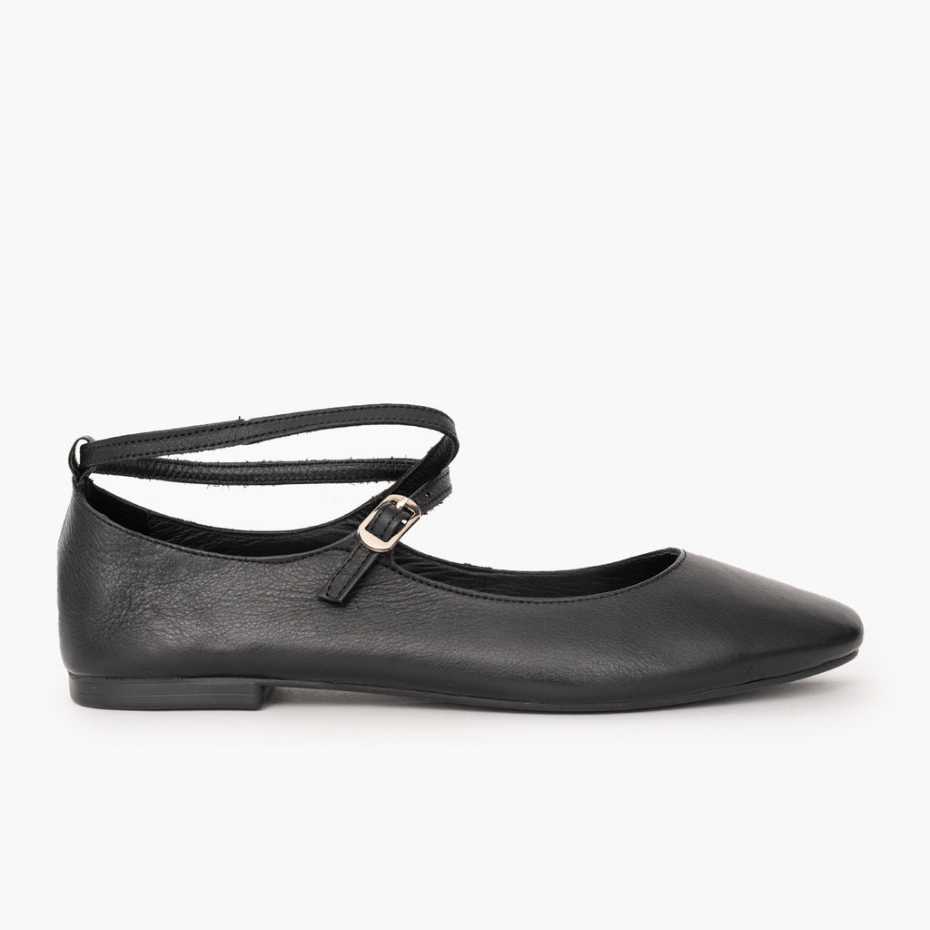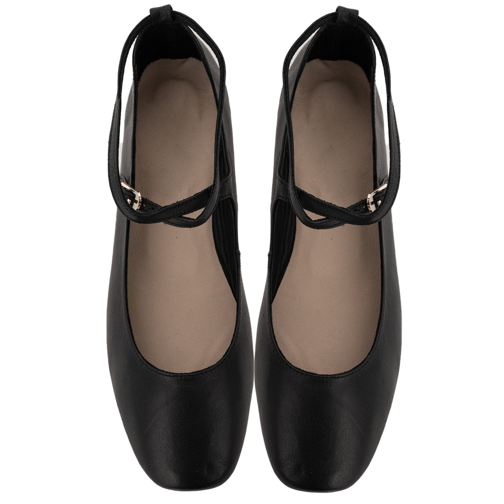 Bailarina con pulsera cruzada fabricada en piel negra.