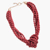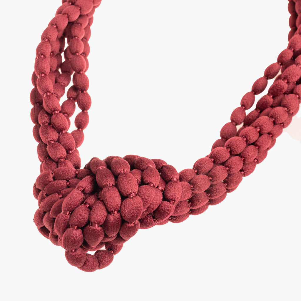 Collar corto de varias vueltas con bolitas de tela burdeos.