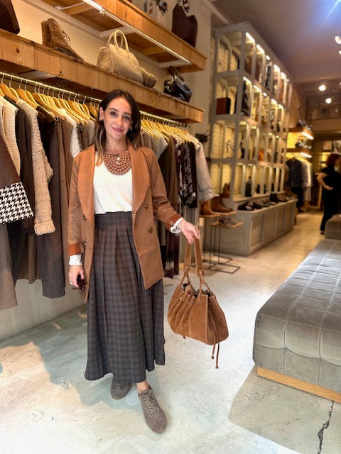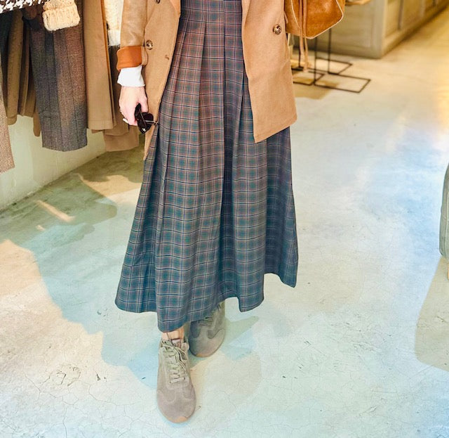 Falda tableada larga con estampado de cuadros en color kaki, azul y teja.