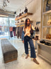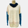 Jersey de punto color beige y camel, con mangas en tejido vaquero azul.