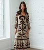 Vestido largo beige con dibujo de flores y ramas en color marrón y burdeos.