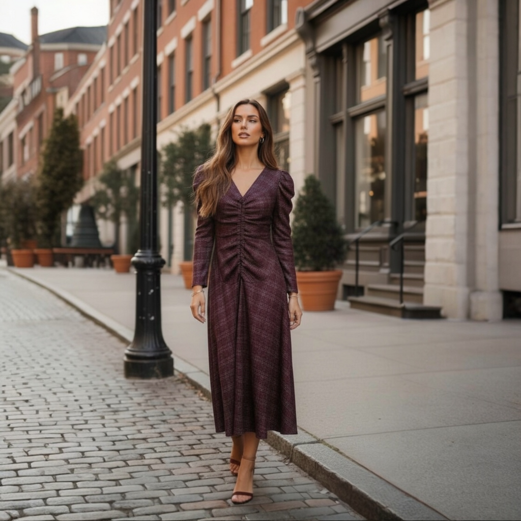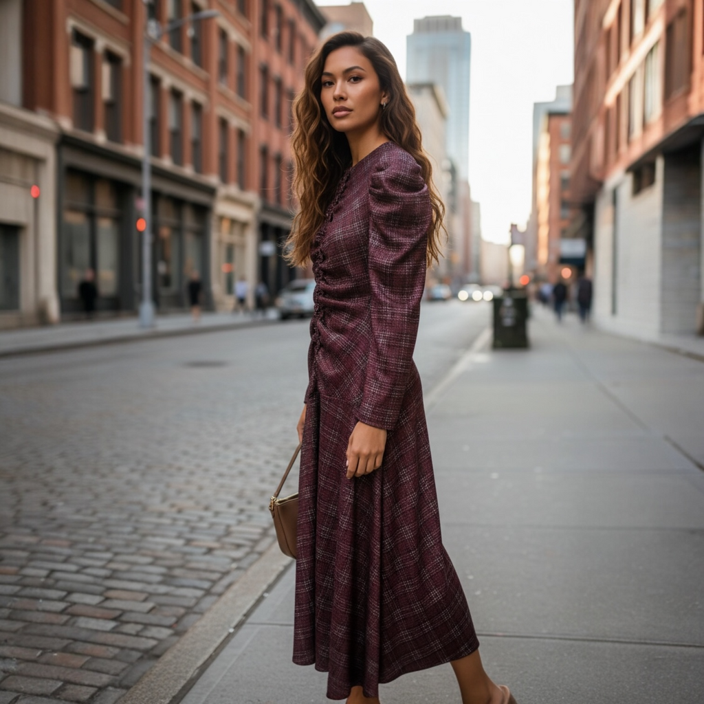 Vestido largo con estampado de cuadritos en color burdeos y toque de azul.